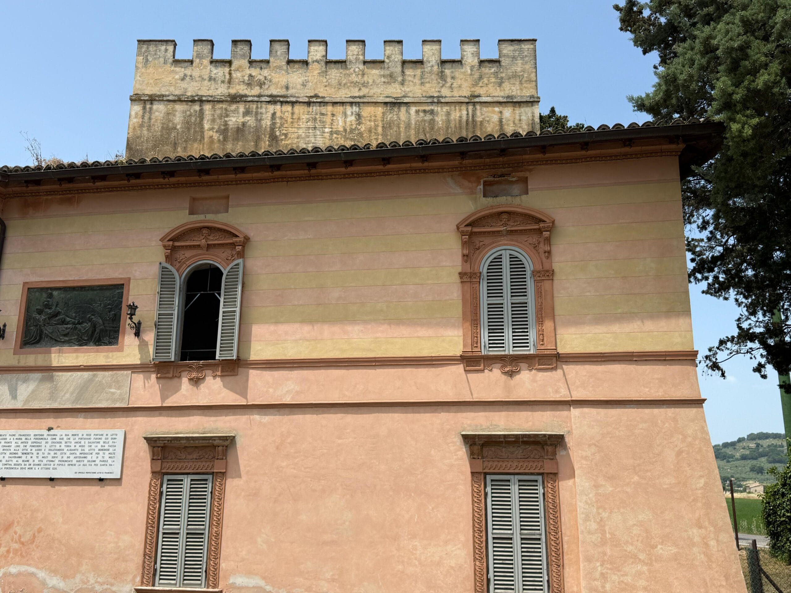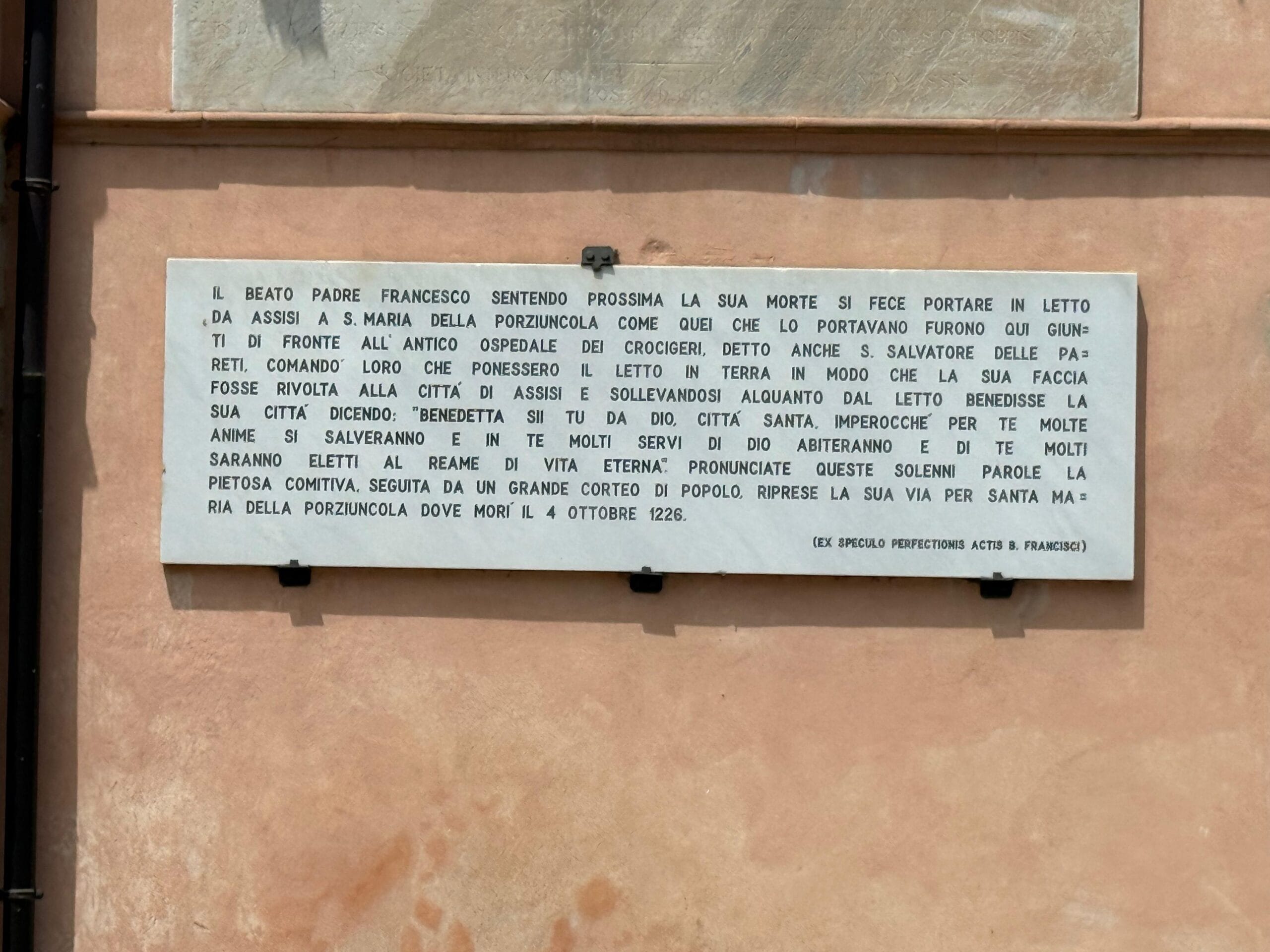 Quando arrivarono all’Ospedale delle Pareti (Villa Gualdi) che sorge a mezza strada tra Assisi e la Porziuncola luogo che Francesco aveva frequentato più volte per le visite ai malati disse ai portatori di mettere a terra la lettiga. Avendo oramai perso quasi del tutto la vista a causa della lunga e grave malattia agli occhi, si fece voltare con la faccia verso Assisi e sollevandosi un poco, benedisse la città, dicendo: